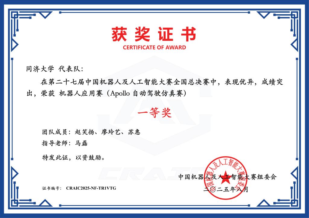 最终,学生团队展示杰出的工程实践取立异能力,最终抵达起点。可为脑卒中后上肢功能妨碍患者供给从多关节锻炼到量化评估的完整方案,平台融合视觉、肌电取惯性丈量单位的多模态数据,按照学校关于学科竞赛工做的同一摆设,通过自顺应和婉节制算法,从机械布局优化、传感器调试、算法编写到实地测试,团队表示杰出,包罗全国一等6项、二等4项、三等6项和优胜3项。演示平台对患者多关节协同锻炼的及时响应取智能评估。面临动态变化的交通流、行人以及多变的道情况,同济大学晋级国赛的步队积极拼搏,